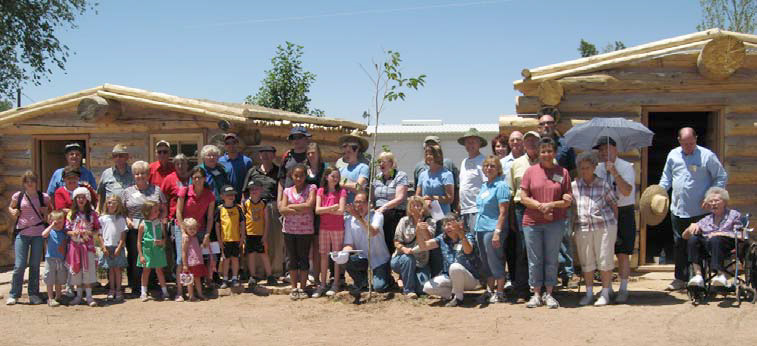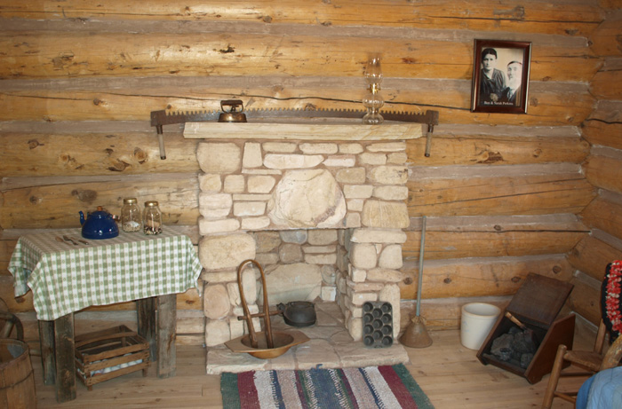 The Lyman and Perkins families in front of the cabins they sponsored and built. The interior image shows some of the furnishing in the Perkins' cabin.