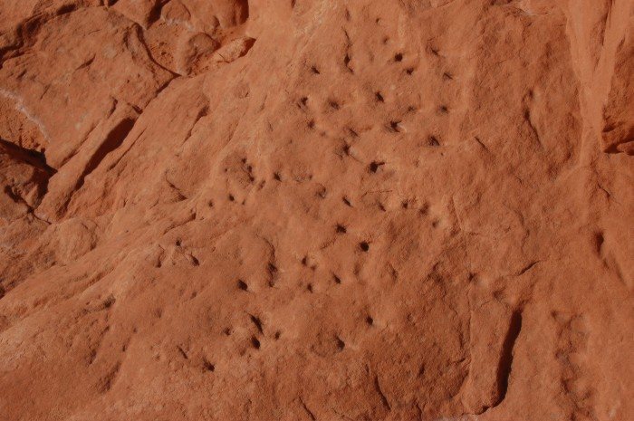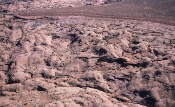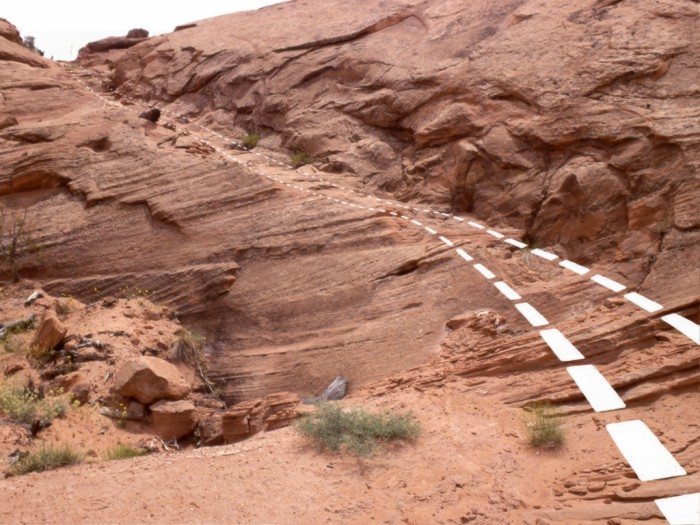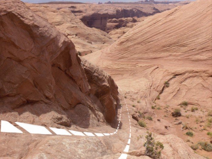 The steep sloping sandstone cliff called Slick Rocks was the only path down from Gray Mesa. Here the pioneers blasted a series of switchbacks back and forth down the cliff face.