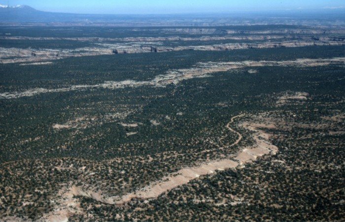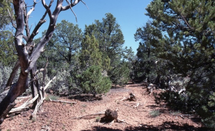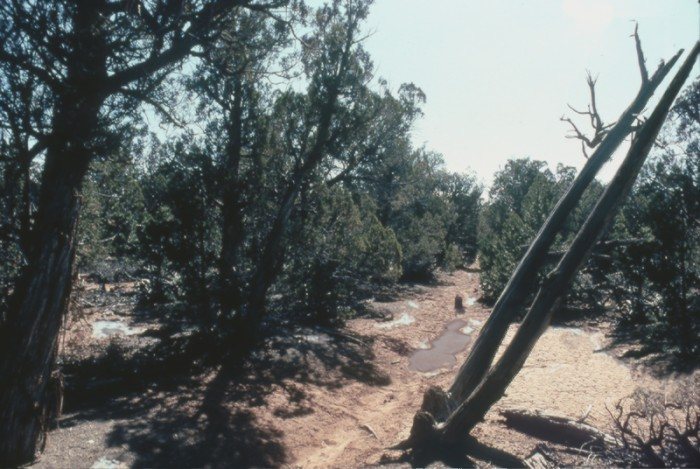 Detouring to the higher elevations to the north brought the pioneers to a thick juniper forest, commonly referred to as the Cedars. Here chopping crews advanced ahead of the wagons to chop a 20-mile path. The uneven terrain also required the construction of dugways (rock fill) to bridge paths down/up ridges and washes.