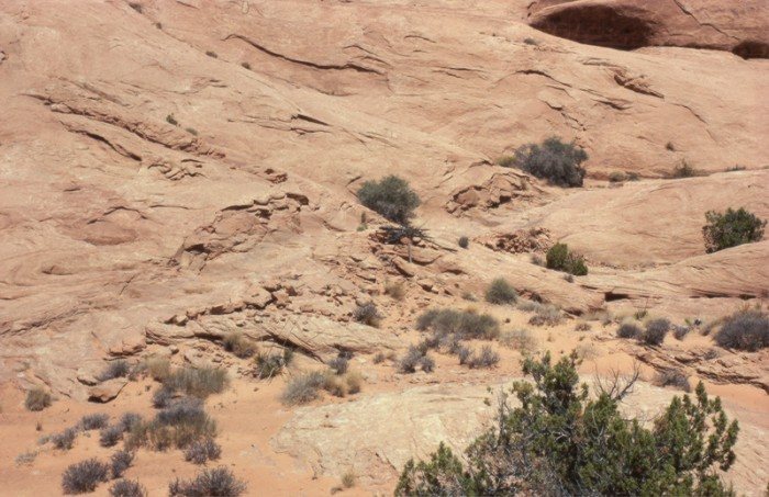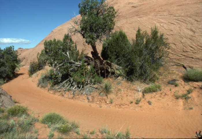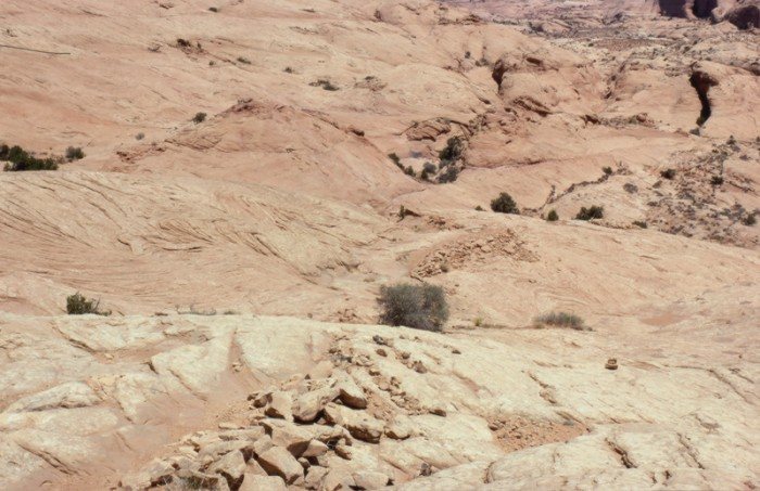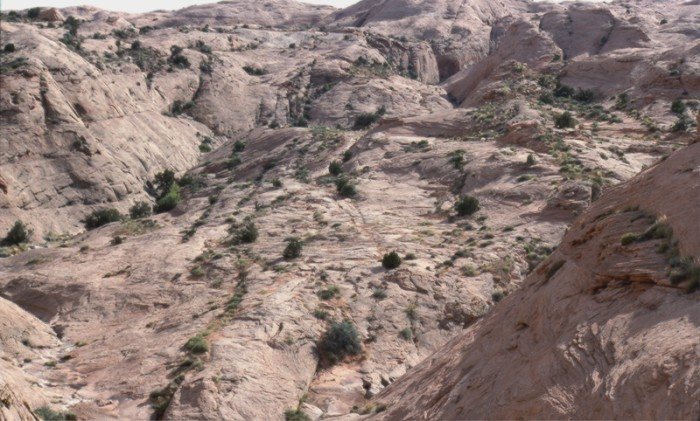 At the top of Cottonwood Hill, the pioneers encountered an extremely rugged area of solid sandstone. This was the terrain that caused the initial scouts to declare that it was not possible to build a wagon road through such country. At the bottom of a sandstone canyon called Ribbon Canyon, the pioneers used a natural water drainage path for their road which they called The Chute. Water which had collected in large natural holes in the sandstone sustained the pioneers and their animals. The natural holes have since been referred to as Mormon Tanks.