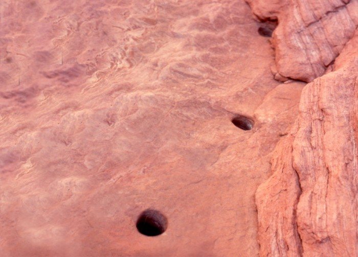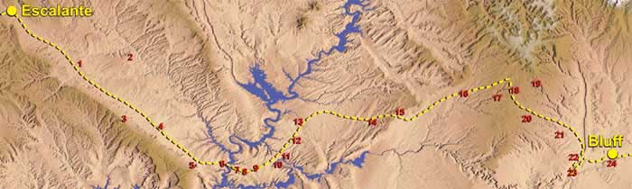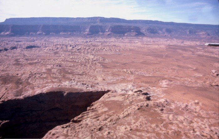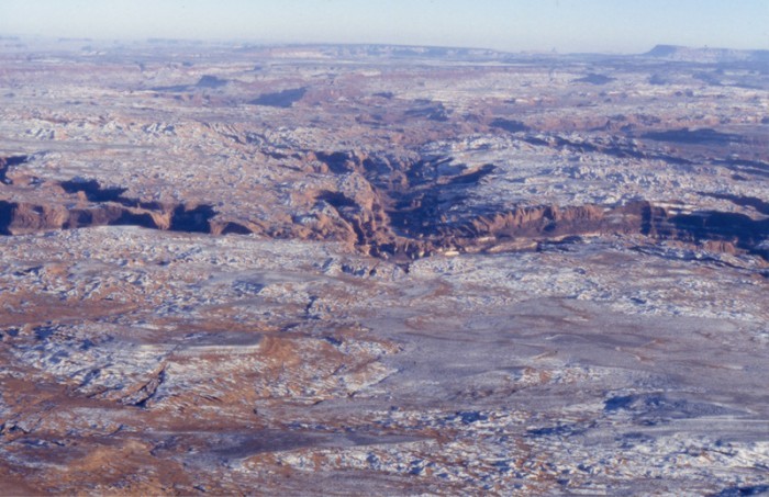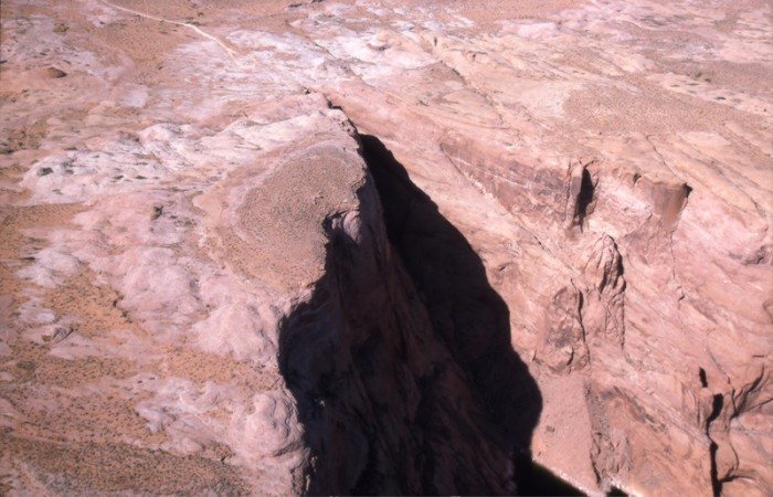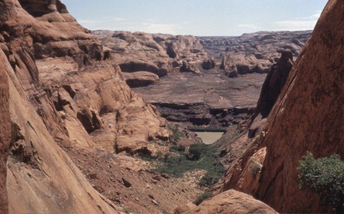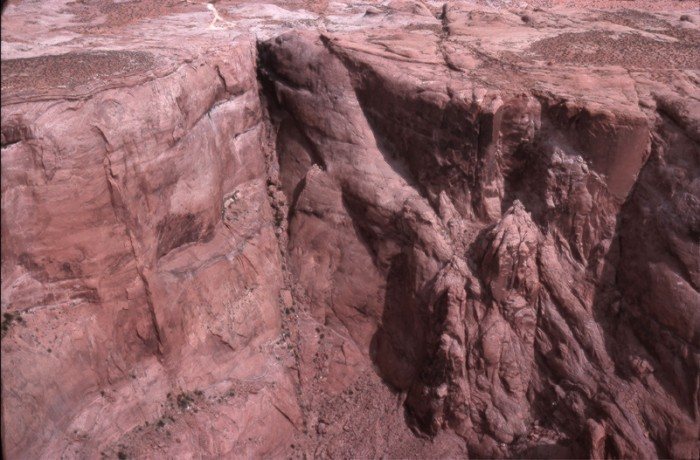 A natural crevice in the west wall of the 1300' deep Colorado River gorge which was widened by the San Juan pioneers to accommodate a wagon road down to the Colorado River. For six weeks during the harsh winter of 1879/80, the pioneers exercised ingenuity and great determination in building their road through the river gorge. |