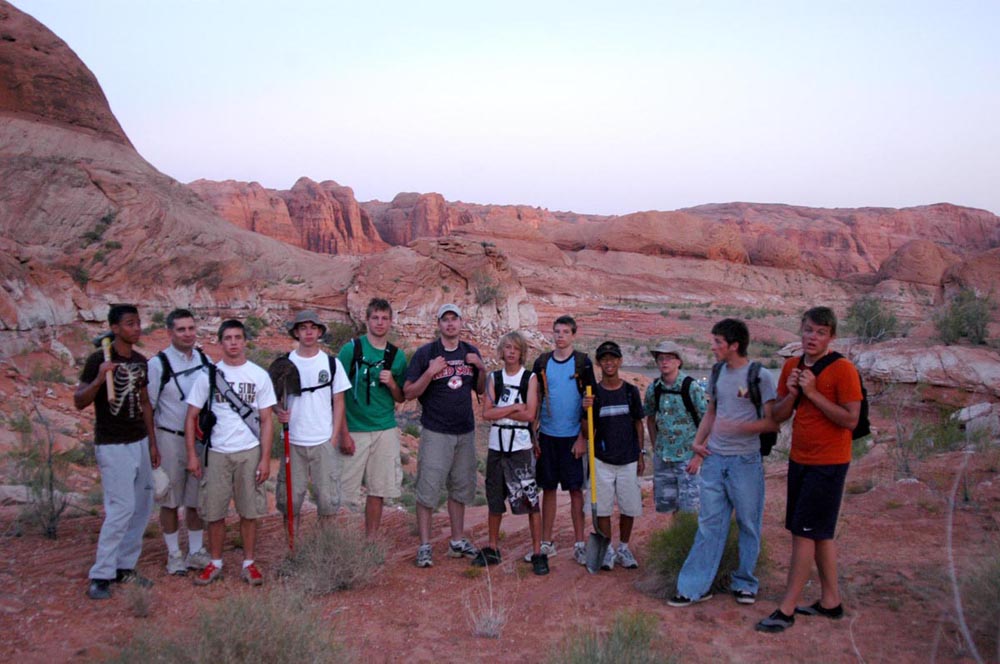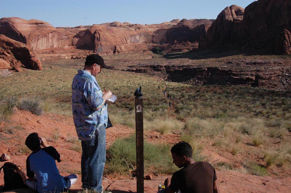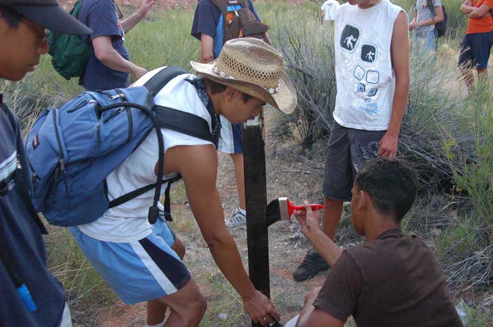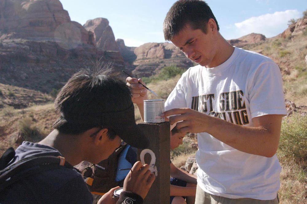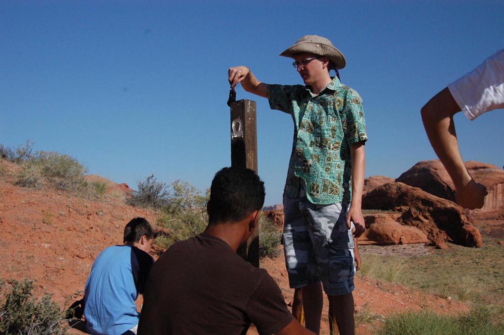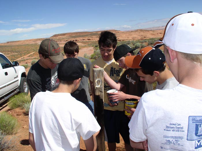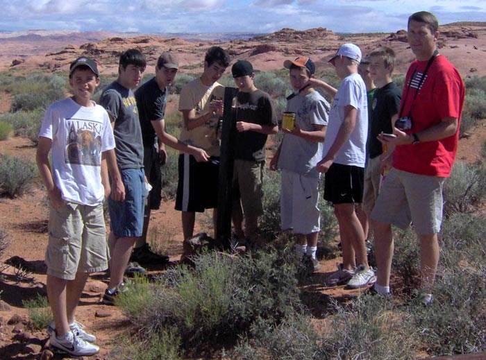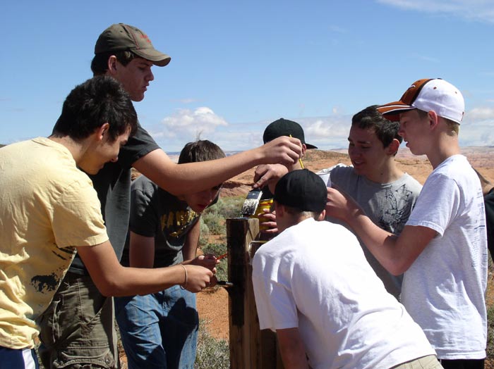 During the week of June 5, 2008, a group of young men from West Haven, Utah, (Varsity Team 625) and their leaders visited the Hole-in-the-Rock area and explored nearby canyons in the Grand Staircase-Escalante National Monument. Their adventure included a service project on the Hole-in-the-Rock Trail. Thanks to these young men, trail markers in the vicinity received a badly needed face-lift. Markers were restained and the wagon symbols were repainted. Brad Clontz said, "I appreciated you letting us work on this. The boys learned a lot about the area and had a great time while we were there."